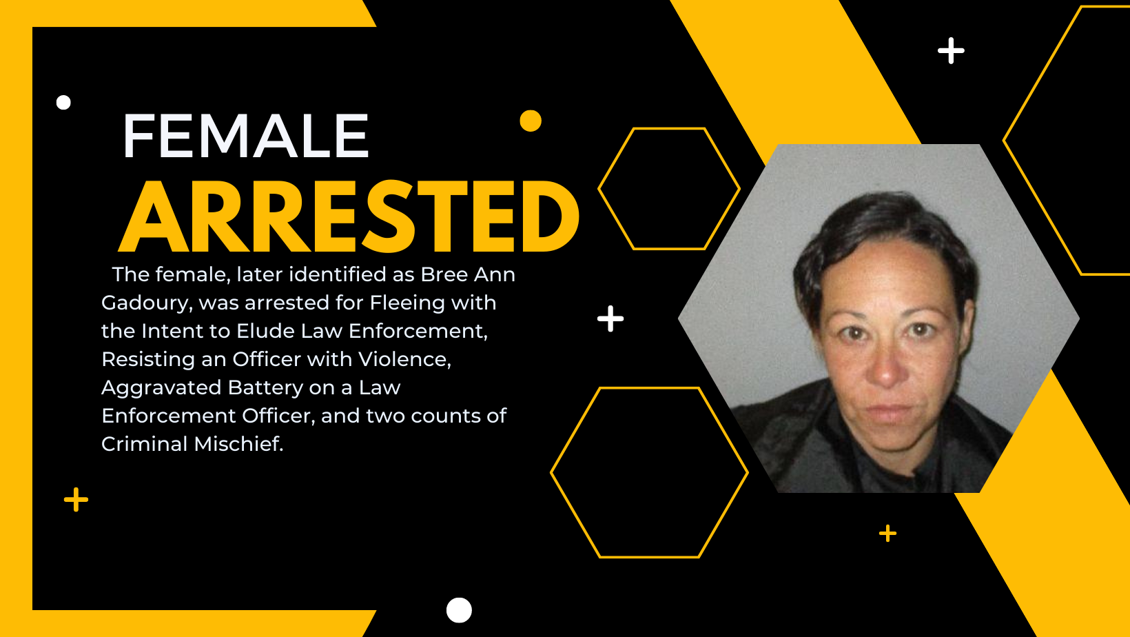 The woman was later identified as Bree Ann Gadoury and was arrested for Fleeing with the Intent to Elude Law Enforcement, Resisting an Officer with Violence, Aggravated Battery on a Law Enforcement Officer and two counts of Criminal Mischief.